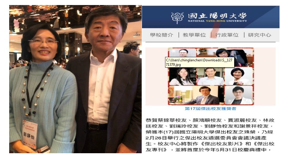 早在這次獲選為國立陽明大學傑出校友之前,劉靜怡董事長在今年1月20日才從衛福部長陳時中手中接下陽明大學校友總會傑出校友獎。當天,「阿中部長」對於劉靜怡董事長,學以致用,企業化管理醫療服務,讚譽有加。事隔幾日台灣爆發武漢肺炎病例,不關機的「阿中部長」變身為防疫指揮官,而劉靜怡董事長成了最佳後勤支援 隊友 。