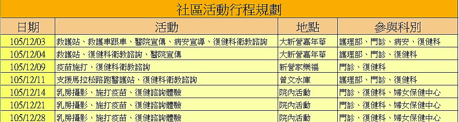 本公司協助台南新興醫療社團法人新興醫院辦理12月社區活動內容如附件
